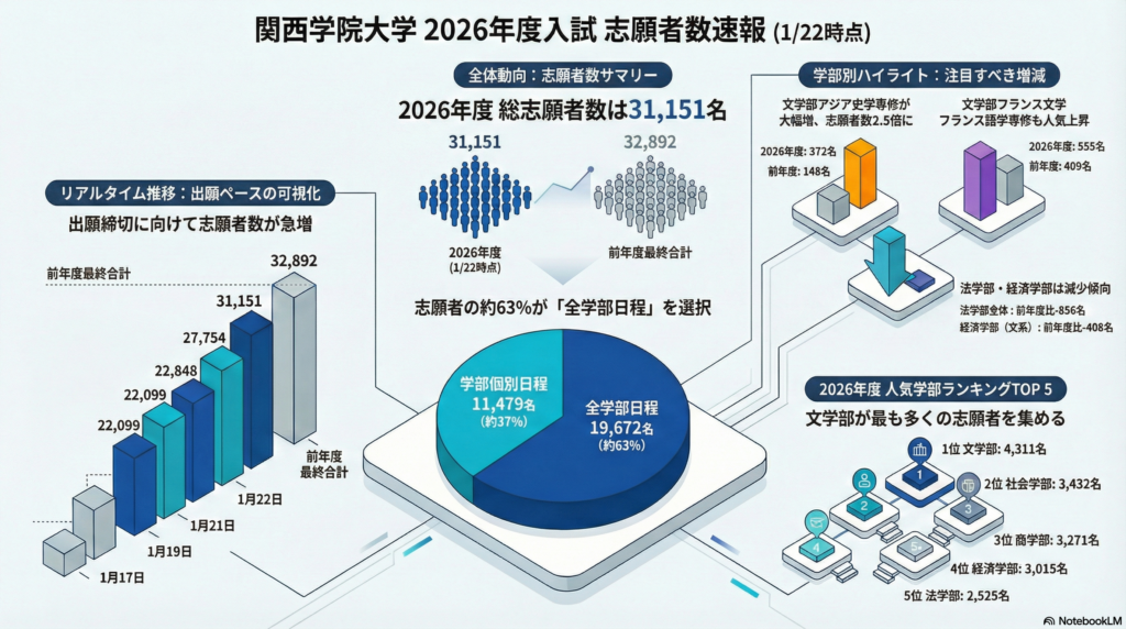◦ 1/21時点では前年割れが目立ちましたが、最終日の大量出願により、全学部日程の合計は19,672人(前年比94.7%)まで回復しました。特に文系主要学部(商・社・文)では前年超えが相次いでいます。