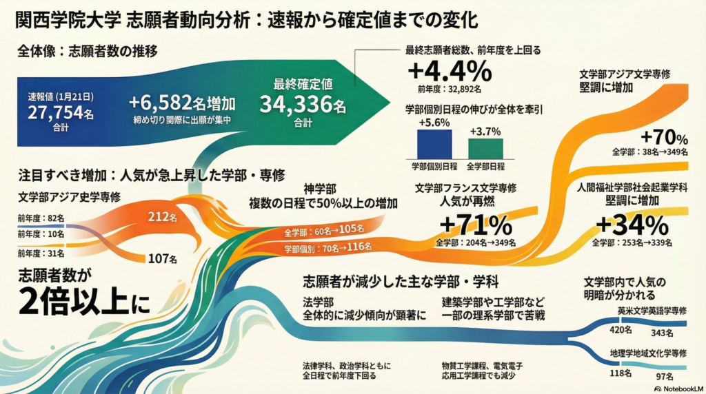 • 1月22日(最終確定): 桁違いの志願者が殺到。特に商学部・社会学部・経済学部で、最終処理のみで数百人単位の上積みが発生しました。
