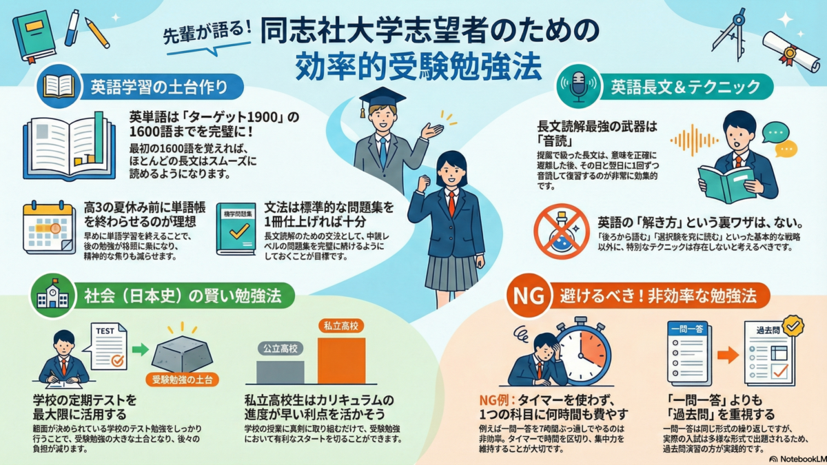 大学受験を有利に進めるための英単語の完成時期や、意外と重要な学校のテスト対策、日本史の効率的な進め方について、現役生と先生の対談形式で掲載します。塾生に11月に公開したものを再編集したものです「英語の音読やタイマー活用術など、今日から試せる具体的なノウハウを公開。